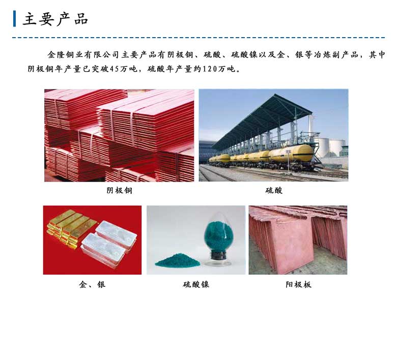 主要产品Q?/strong>金隆铜业有限公司主要产品有阴极铜、硫酸、硫酔R以及金、银{冶炼副产品Q其?..   >>详细信息